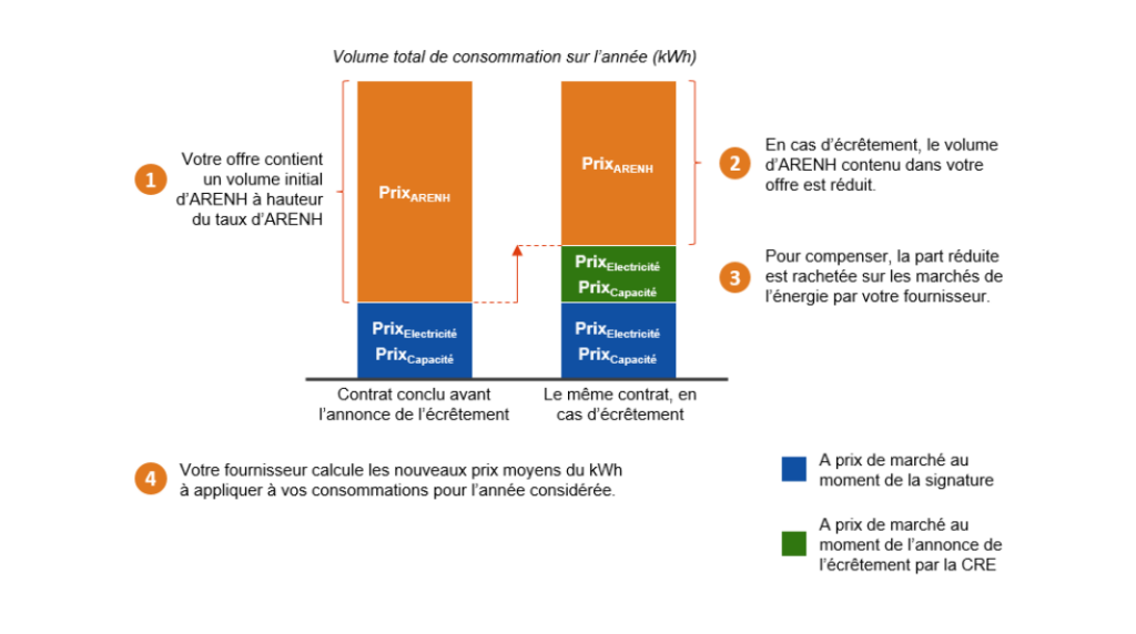 L’ARENH permettait aux fournisseurs alternatifs d’acheter jusqu’à 100 TWh d’électricité issue du parc nucléaire d’EDF chaque année, à un prix régulé fixé par la CRE (42 €/MWh). Ce quota était réparti entre les fournisseurs (EDF compris), permettant à ces derniers de composer des offres compétitives pour leurs clients professionnels et de limiter l’exposition à la volatilité des marchés internationaux.